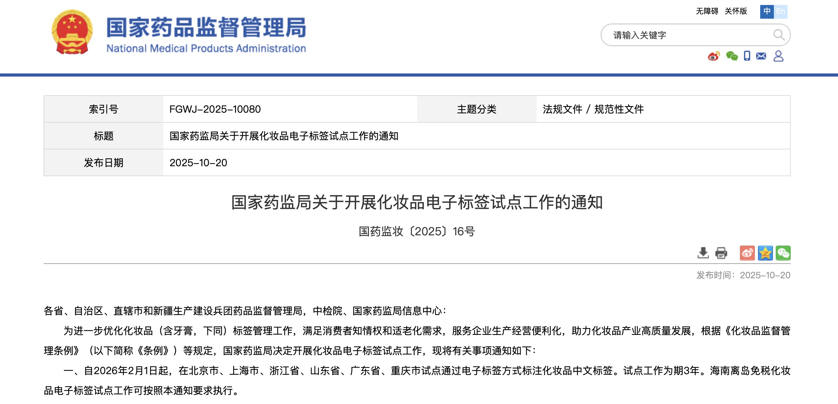2025年10月20日,为进一步优化化妆品(含牙膏)标签管理工作,国家药监局正式发布《关于开展化妆品电子标签试点工作的通知》(以下简称《通知》)。宣布自2026年2月1日起,在北京、上海、浙江、山东、广东、重庆等六省市率先开启为期3年的化妆品电子标签试点工作。海南离岛免税化妆品电子标签试点工作可按照《通知》要求执行。